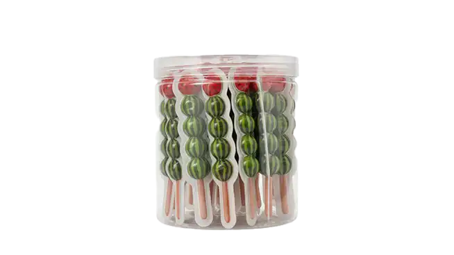 Make your next celebration extra sweet with our Fruity Candy Skewers. Each skewer features a playful stack of chewy, watermelon-patterned spheres topped with a bright strawberry candy “cherry.” Perfectly packaged in a clear, resealable tub, these treats are as visually striking as they are tasty, making them a hit for party favors, candy buffets, or a special afternoon snack